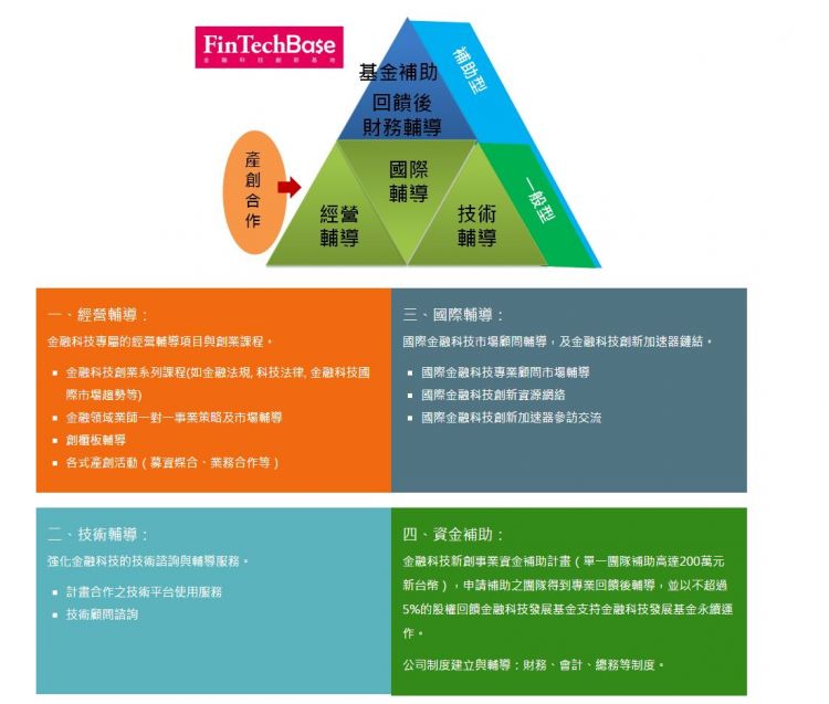 因此,為加速國內金融科技新創事業發展,「金融科技創新基地」將與國內外各大育成中心、創新加速器對接,鼓勵引薦水平型創新加速器裡,主題為金融科技相關的優質新創團隊,進行領域專屬的新創事業輔導與銜接以金融科技為主的創新網絡資源。